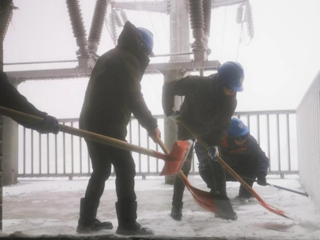 1月22日早8点,天塘山风电场110kV印天出线覆冰达13毫米,急需融冰。地电公司天塘山项目部以雪为令,迎雪而战,迅速行动,项目部全体工作人员纷纷手持锹等除雪工具,迎着刺骨的寒风以及鹅毛大雪,爬上融冰平台进行融冰和铲雪,清除线路以及平台上的冰块。为防止二次结冰,每间隔一小时进行线路巡检,观察线路覆冰现象,观察直流融冰情况,测量并记录三相融冰刀闸温度。经过三个小时的鏖战,印天线的线路覆冰全部消融,线路隐患暂时得以消除,为湖南电网抗冰保电贡献了一份力量。